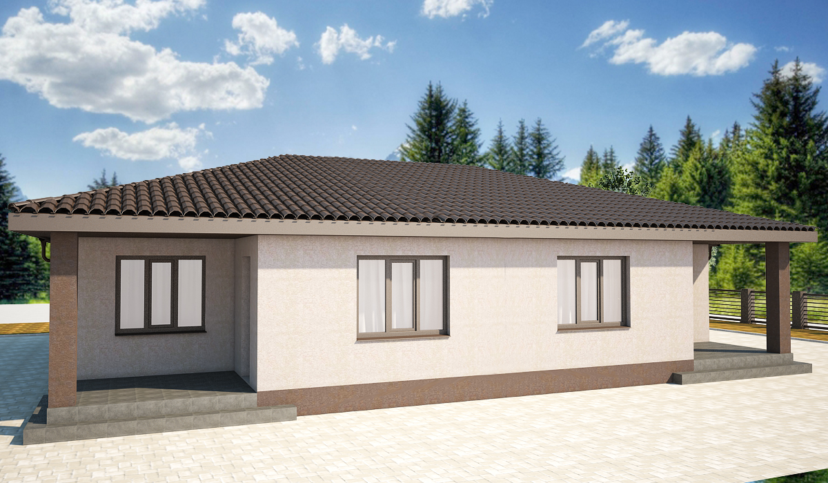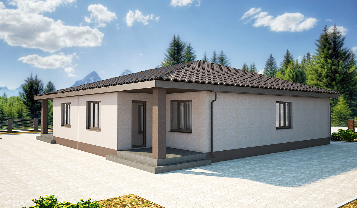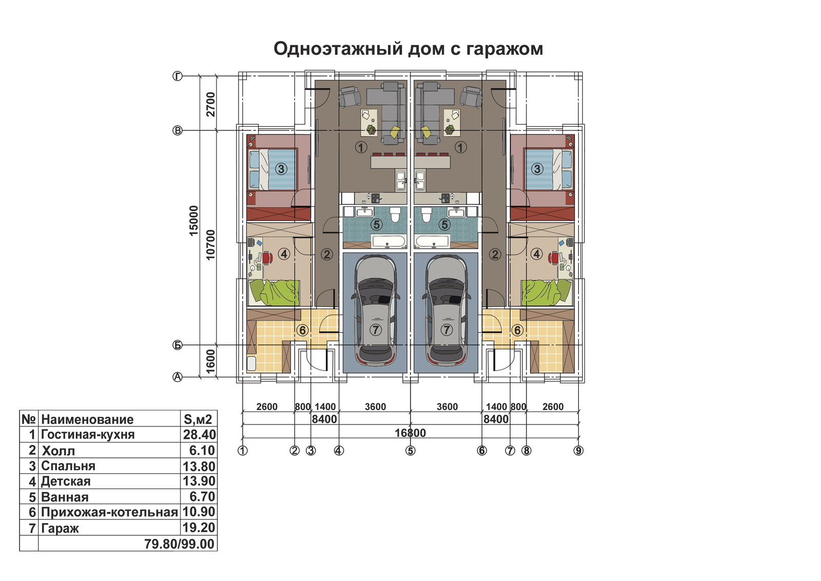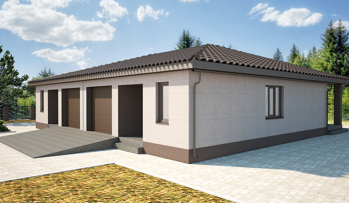 Этот проект представляет собой красивый и удобный одноэтажный блокированный дом с гаражом. Его внешний вид прекрасно сочетается с современной практичной планировкой интерьера.